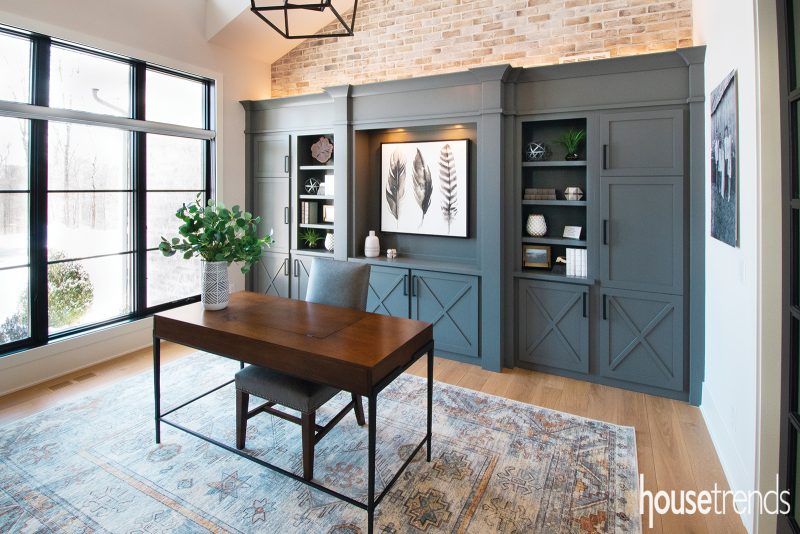 This light-filled study is an attractive option for remote work. Painted wall-to-wall built ins are finished with an applied X detail. Source: C&W Custom Woodworking, candwcustomwoodworking.com