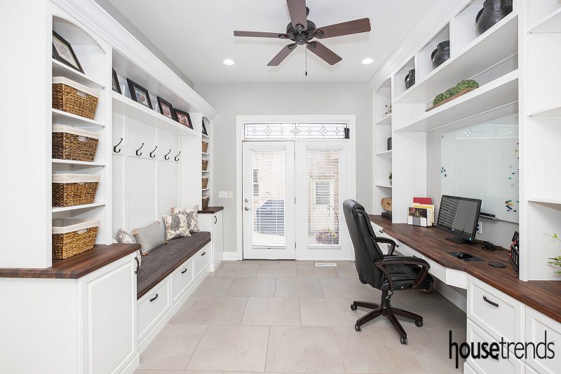 Plenty of bright built-ins in the form of shelving, cabinetry, a bench and a desk replaced dark, freestanding pieces in a back entry overhaul which now doubles as a mudroom and home office in the Cincinnati area. Source: Neal’s Design-Remodel, neals.com