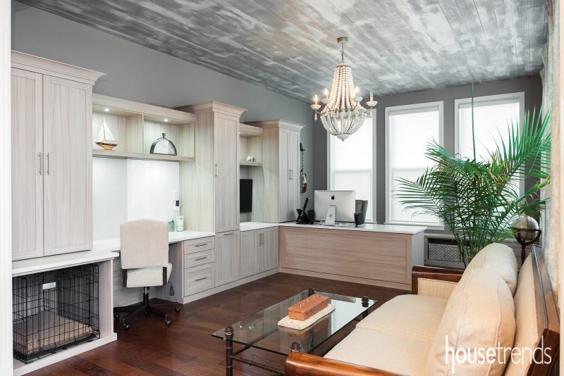 An elegant chandelier adds a bit of glow in this generously-sized space that serves as a home office for two. The distressed ceiling and cabinet finishes add to the Nantucket style of the room. And there’s a bonus space for the family’s dog. Source: California Closets, californiaclosets.com