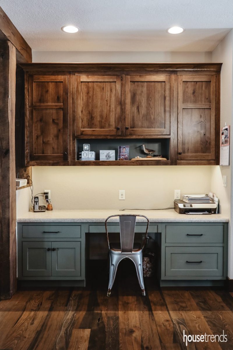 This workspace sits at one end of the kitchen in a rustic home in Miami County. The custom built upper cabinets are a stained hickory, and the lowers are painted Sherwin-Williams Dried Thyme to match the nearby island. Source: Peters Cabinetry, peterscabinetry.com