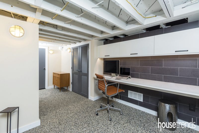 Unclaimed space in the basement of a 1920s Columbus area residence is transformed into a home office with a contemporary color scheme. Open framing, painted white, helps combat the feeling of low ceilings. Source: J.S. Brown & Co., jsbrowncompany.com