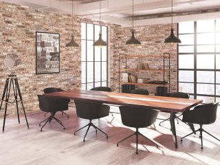 Side view of modern red brick loft conference room interior with empty poster, equipment and city view. Mock up, 3D Rendering