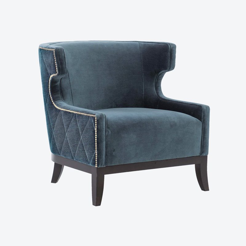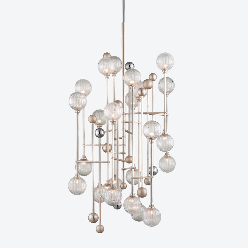 Certain design elements of the kitchen – such as the Vermont Danby marble, a large brass chandelier and the abundance of windows – are repeated in the two-story great room so as to unify both spaces. The marble surrounding the great room’s fireplace, for instance, perfectly complements the marble in the kitchen. Marksberry assisted with the great room’s modern furnishings, selecting items that mirror the gray color palette but also boast pops of color. The unique painting on the wall adds a nautical touch that reminds the homeowners of the scuba diving they did on their honeymoon. The artwork also reflects the colors of the pool tile and certain accents within the great room.